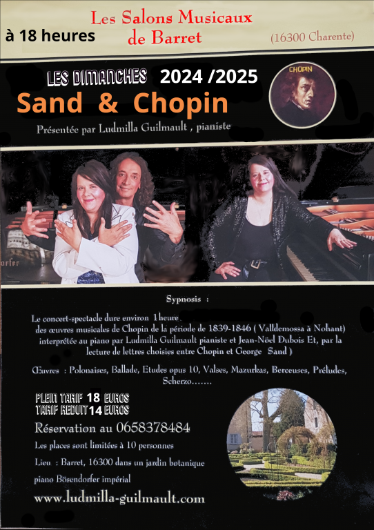 mots clés: Sand, Chopin, concerts-spectacles, Nohant, lecture, tea time, Ludmilla Guilmault, pianiste concertiste, Ballade de Chopin, Scherzos, Etudes de Chopin, Chopin, Valldemossa, correspondance Chopin et Sand, un hiver à Majorque, pianistes concertistes, Duo Cziffra, lectures , Charente, Barret, jardins musicaux, eterritoirefr,infiniment Charente, Sud-Charente, Nohant, Val-de-Loire, les Salons , Musicaux de Barret, eterritoire , Duo Mythique, tous voisins, Barret, 16 Agenda Culture .Sand et Chopin; Sud-Charente, SUD -OUEST, Charente, jardin botanique, Nohant, Sand et Chopin, (le Duo Mythique), Chopin, un hiver à Majorque, Valldemossa.....Espagne, Barret, Billet-Réduc , Jardin botanique, infos concerts, sortir 16, Billet-réduc,Evènements en France, les choses à faire à Barret, Barret Charente concerts et spectacles Performances, event brite, event , billeterie, tous voisins, Barret Mairie, Barbezieux, Conseil Départemental 16, Charente , Musset, Sand, Paris, couple mythique, musique, Le Berry, livres, Flammarion, Nohant, La Châtre, département 36, sortir 16 en Charente, Duo Mythique sand et Chopin, succès, public unanime....BILLET RÉDUC , réveillon.Décembre 2021, concert-spectacle Chopin Sand, piano à 4 mains, SUD CHARENTE, STAGES , SALONS MUSICAUX SALONS MUSICAUX